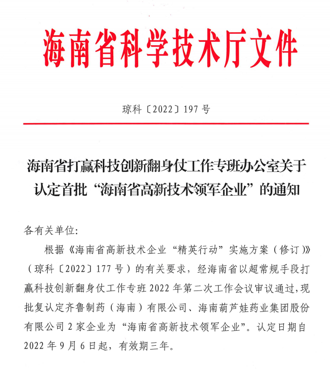 近日,海南省科学技术厅发布的《海南省打赢科技创新翻身仗工作专班办公室关于认定首批“海南省高新技术领军企业”的通知》中显示,批复认定海南OG视讯药业集团股份有限公司等2家企业为“海南省高新技术领军企业”。认定日期自2022年9月6日起,有效期三年。
