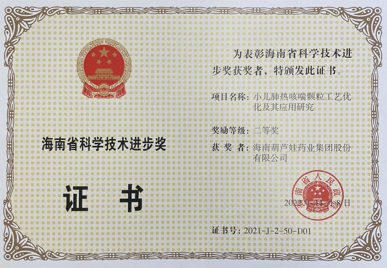为此,小儿肺热咳喘颗粒的制备方法获得了第二十一届中国专利优秀奖(2019年),专利申请号:ZL201010134951,此次作为专利技术的应用,获得了2021年度海南省科学技术进步奖二等奖。在此之前,OG视讯牌小儿肺热咳喘颗粒还多次被授予“临床价值中成药品牌”、“中国连锁药店最具合作价值单品”,荣登“中国医药品牌榜”。